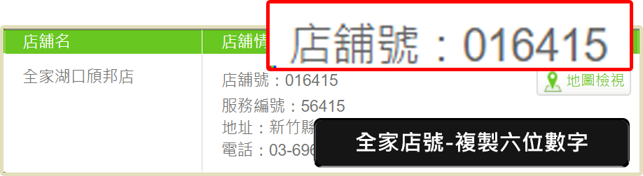 ➌ 頁面顯示的門市表格,店號欄位資料即該超商的門市店號。